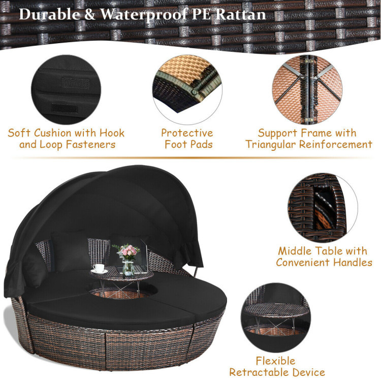 Durable and sturdy steel frame to keep stableLightweight and premium PE rattan material for long lifespanEquipped with adjustable table to meet different requirementsWeather resistant retractable canopy can be used to block sunlightSoft cushions and pillows for comfortable seating experienceStylish and modern design is ideal for patio; balcony and poolsideThe daybed can be separated into 3 chairs for multiple usesThe cushion features with zippers for easy cleaningEasy to assemble