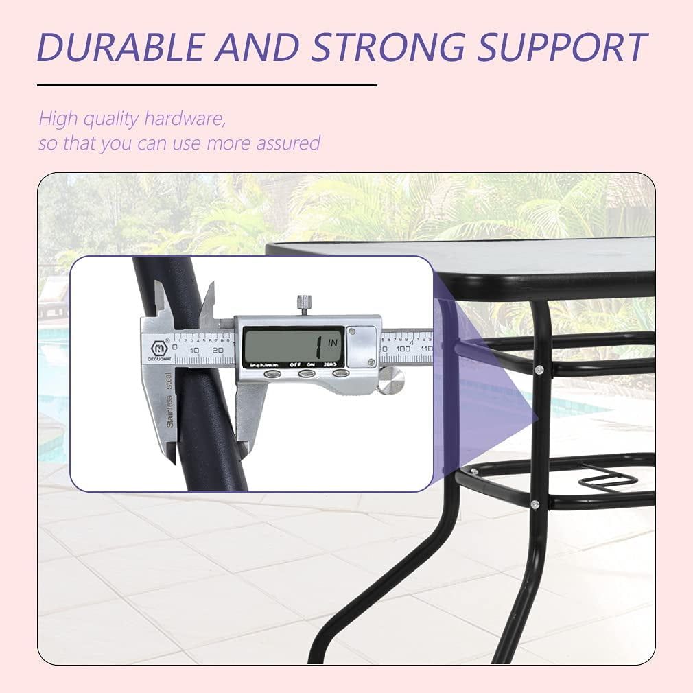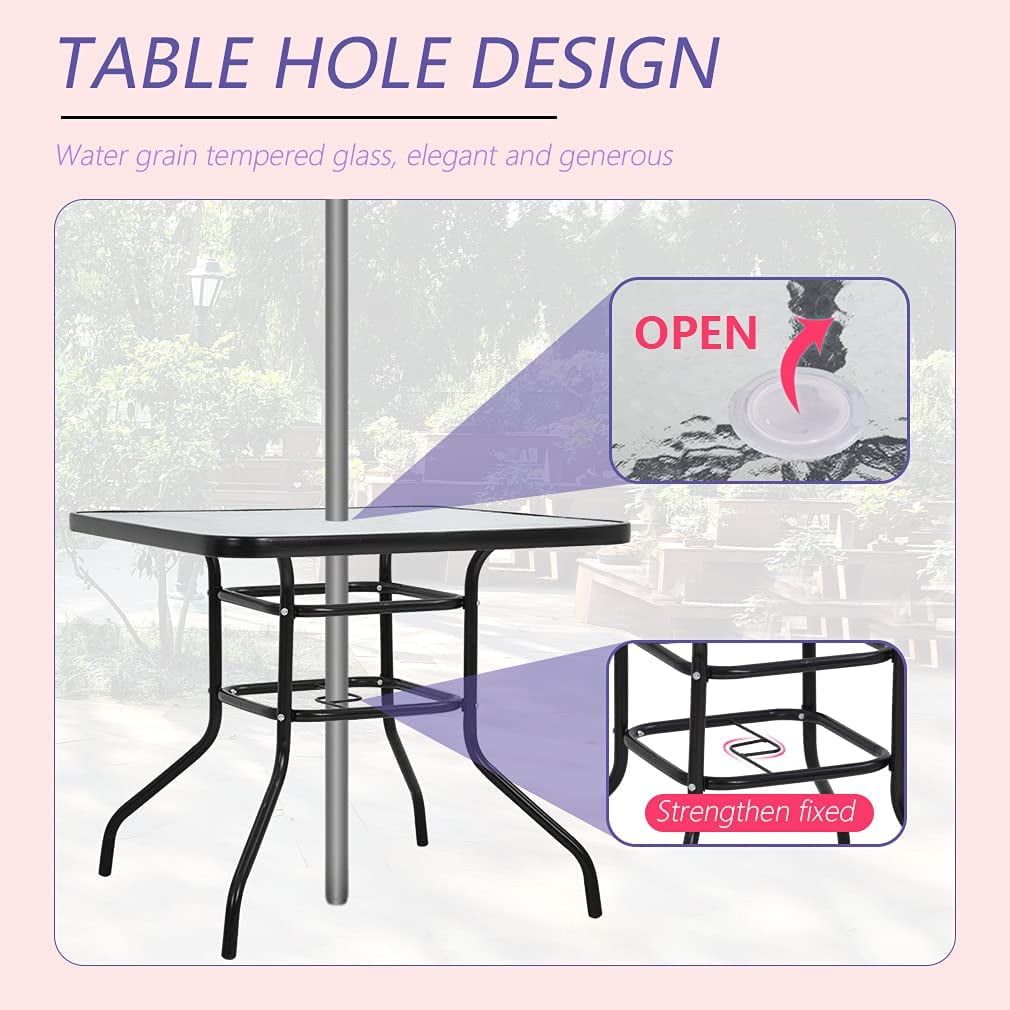 Stylish black metal square design enhances any outdoor spaceComfortably accommodates four people for dining, reading, or working poolsideFeatures an umbrella hole for added shade and protection from the sun (umbrella not included)Table dimensions: L32" x W32" x H28"Constructed from durable glass and steel materials for long-lasting use