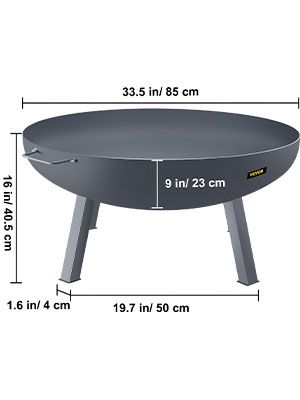 1.Large Size Fire Pit: Fire Pit Bowl Dimension: 33.5'' W x 9'' D, weighs 40.8 lbs. The Thickness of the Bowl: 0.1''. The Thickness of Legs: 1.6''. Total 16'' in height when it stands. The multifunctional fireplace is large enough, perfect for keeping warm, making BBQ, etc. Note: The BBQ net is NOT INCLUDED.